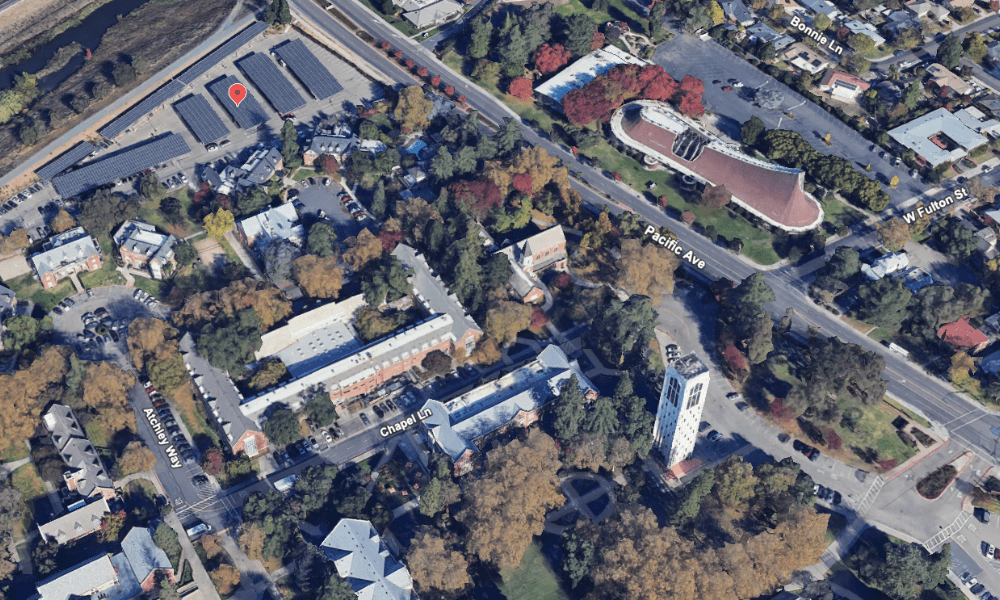 While this area is tucked away, it’s easy to find. Start by heading to Pacific Avenue, which runs along the east side of campus. At the traffic light, turn onto campus and head right toward Burns Tower.